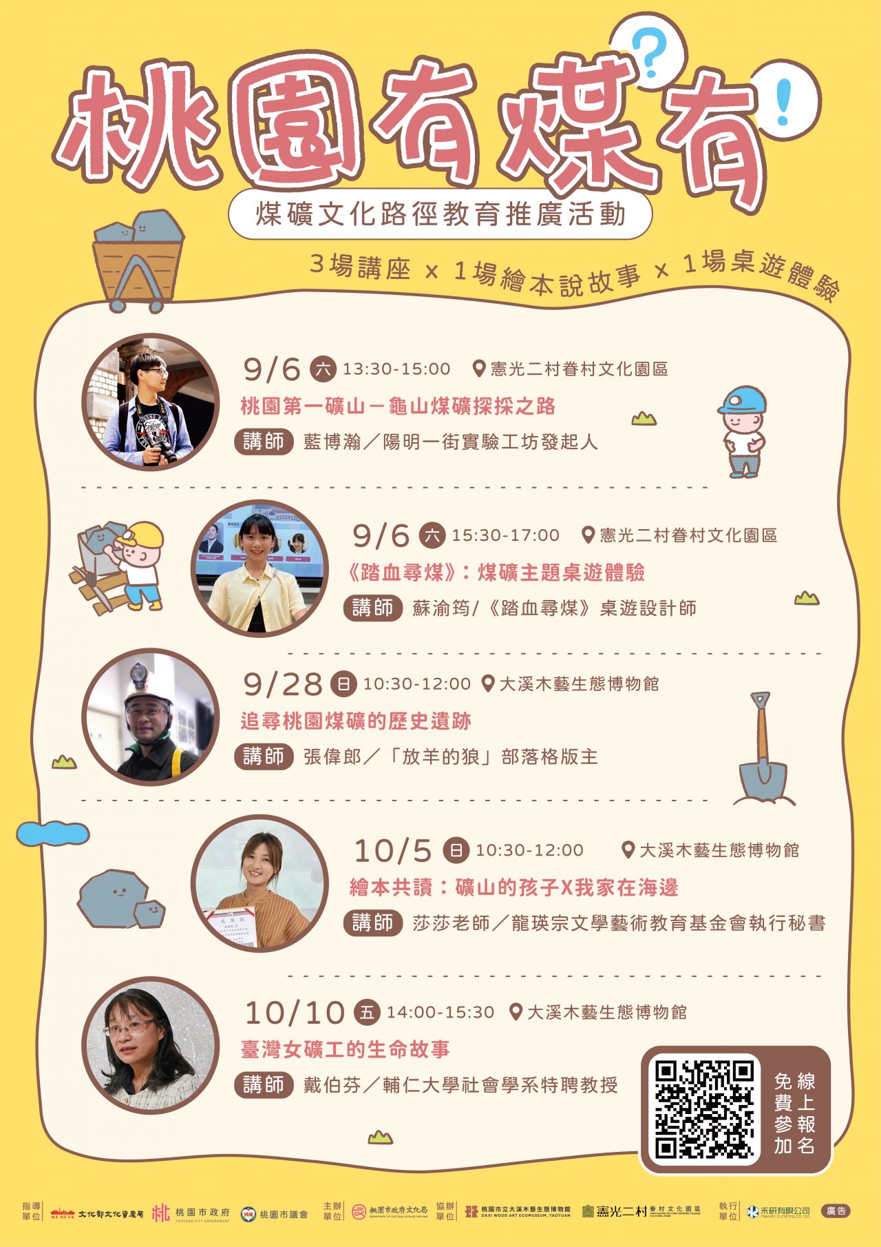 一、 | 旨揭系列活動為延續本局煤礦普查及文化資產價值綜合調查評估等研究資料,與「2024臺灣文化路徑桃園煤礦推廣教育計畫」之執行成果,持續辦理以臺灣文化路徑為核心,桃園煤礦為主題的推廣教育計畫,並透過多元類型活動,引領大眾認識桃園煤礦文化,探索城市發展與產業關係,一覽桃園煤礦產業豐富的樣貌。 |