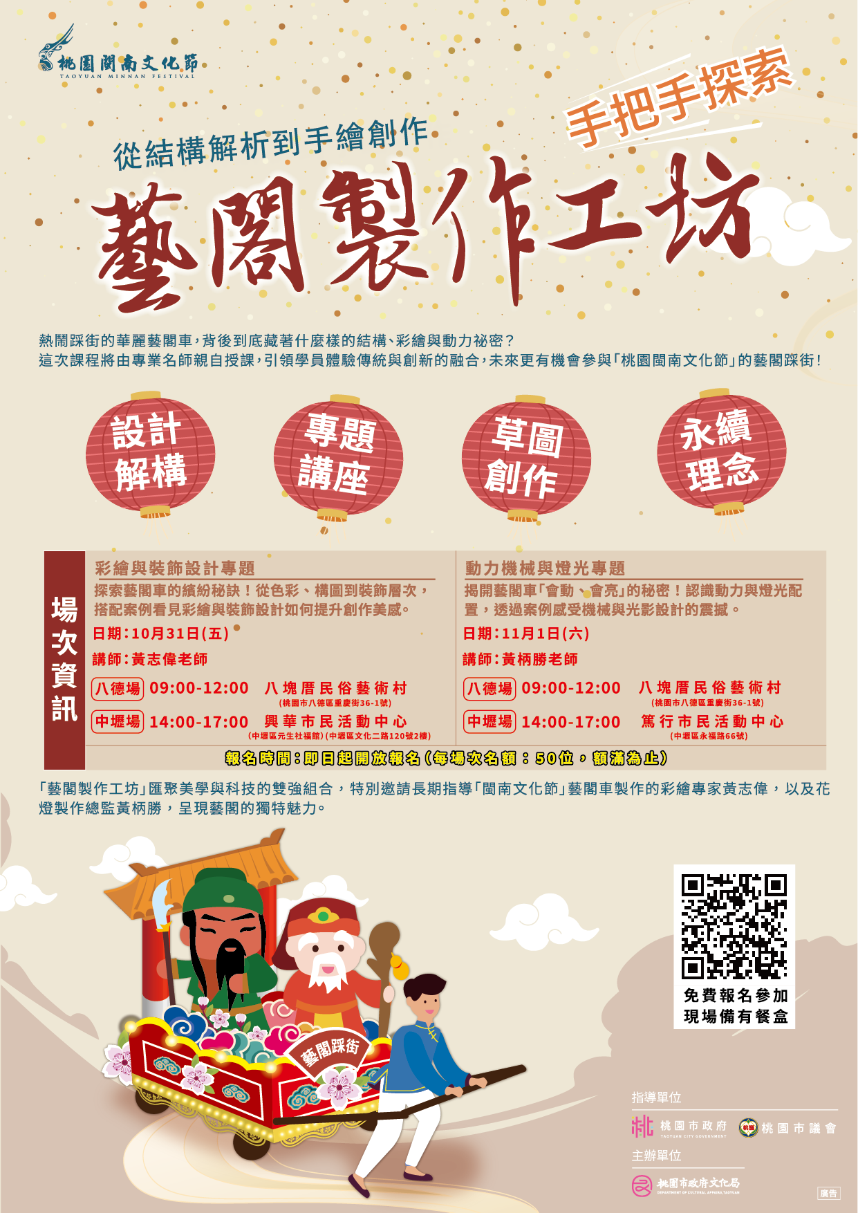二、 本次徵件期間舉辦4場次「藝閣製作工坊」,114年10月31日及11月1日於中壢區、八德區辦理,邀請專業名師引領民眾認識藝閣工藝結構與設計原理,包括車體組成與造景、彩繪、動力機械、燈光,及環保創作介紹。